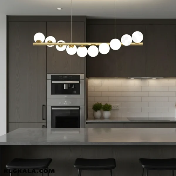 طراحی مدرن و منحصر به فرد: طراحی خطی و منظم حبابها در کنار بدنه فلزی، ظاهری مدرن و مینیمال به این لوستر بخشیده است.
