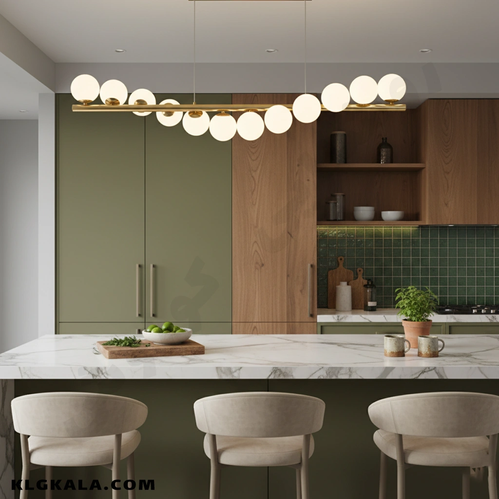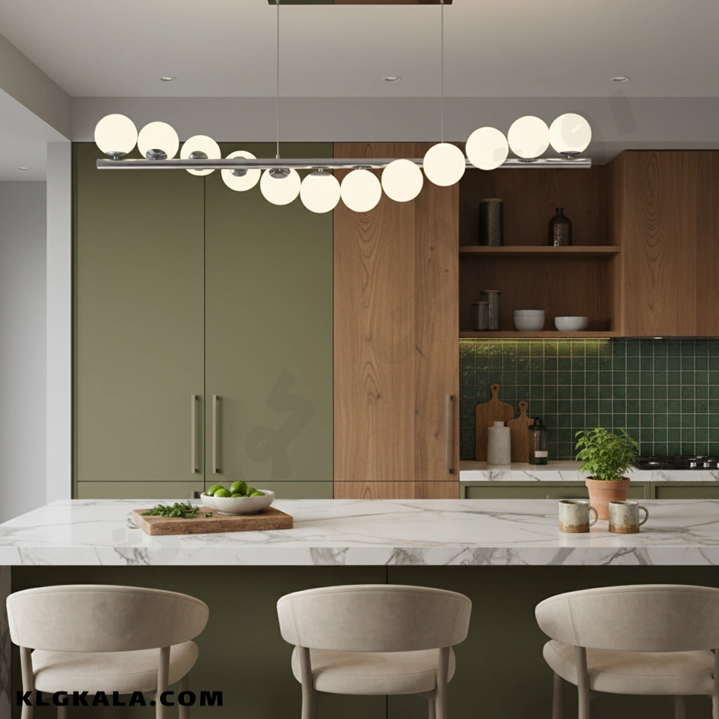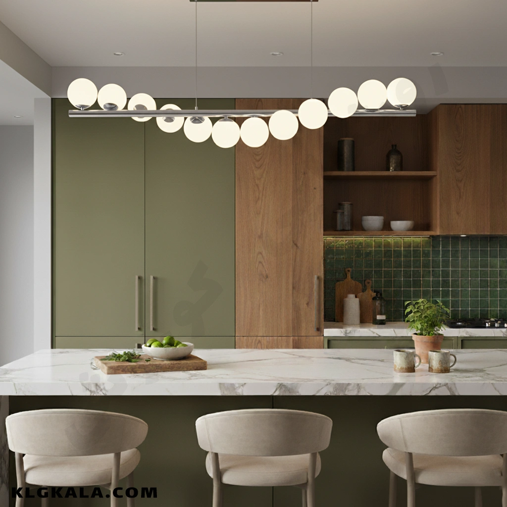 طراحی مدرن و منحصر به فرد: طراحی خطی و منظم حبابها در کنار بدنه فلزی، ظاهری مدرن و مینیمال به این لوستر بخشیده است.